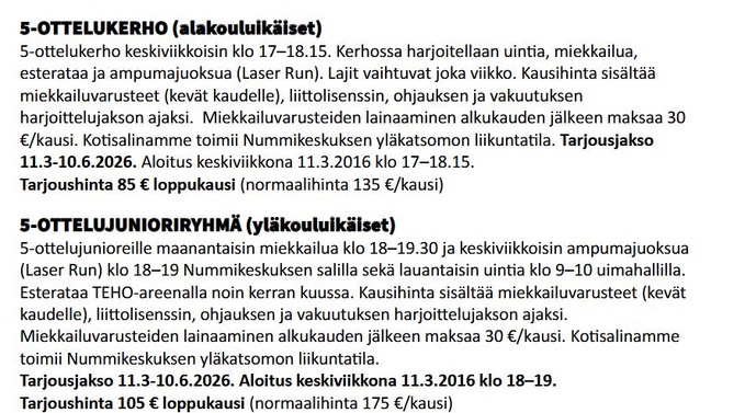 5-ottelukerho kerholaisille keskiviikkoisin klo 17–18.15. Kotisalinamme toimii Nummikeskuksen yläkatsomon liikuntatila. Kerhossa harjoitellaan uintia, miekkailua ja ampumajuoksua (laser run) sekä esterataa. Voit tulla mukaan, milloin vain! Ilmoita vaan Willelle tai Antille, milloin olet tulossa tutustumaan!.