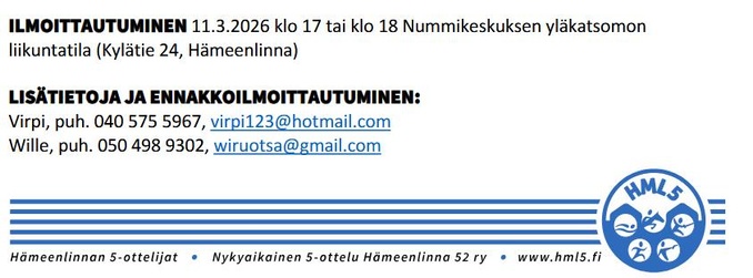 HÄMEENLINNAN 5-OTTELIJOIDEN (HML5) HARJOITUSRYHMÄT JA HARJOITUSAJANKOHDAT SEKÄ HINNAT VUODELLE 2026. KEVÄTKAUSI 7.1-12.6.2026
