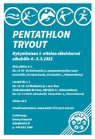 5-OTTELUN ALKEISKURSSI VIIKONLOPPUNA 4.-5.3.2022 AIKUISILLETULE KOKEILEMAAN!! 5-ottelun tryout -kurssilla pääset tutustumaan seuraaviin 5-ottelulajeihin: uintiin, miekkailuun ja ammuntajuoksuun (Laser Run). Viides laji, esteratsastus, ei toistaiseksi sisälly ohjelmaan. Alkeiskurssi on tarkoitettu 18-vuotiaille ja sitä vanhemmille kunto- tai kilpaurheilusta kiinnostuneille. Ohjelma:Perjantai 4.3.2022 klo 17.30-19 Aloitusinfo & Ampumaharjoitus laserpistoolilla / Ortelan koulu (Ortelantie 1, Hämeenlinna) Lauantai 5.3.2022 klo 10.30-12 Miekkailu/Laser Run (Säästöpankki Areena, Härkätie 17, Hämeenlinna) klo 13-14 Uinti (Uimahalli, Uimarintie 2, Hämeenlinna) Hinta: 50 euroa Ilmoittautuminen seuraavall asivulla olevalla lomakkeella mielellään ennen 18.2.2022!!