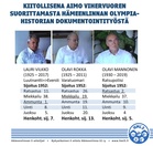 AIMO VIHERVUOREN YKSI MONISTA KULTTUURITEOISTA OLI HÄMEENLINNAN OLYMPIALAISTEN 5-OTTELUN PRONSSIMIESTEN HAASTATTELU VUONNA 1995. Hämeenlinnan olympialaisten vuoden 1952 olympiakisojen 5-ottelun pronssimiesten haastattelun suoritti kauppaneuvos ja Hämeen Sanomien entinen toimitusjohtaja Aimo Vihervuori (1922–2007) vuonna 1995. Osin jo unohduksissa ollut haastatteluaineiston sisältöarvo on autenttisuudessaan suorastaan korvaamaton, haastateltavat olivat tuolloin hyväkuntoisia 65–70-vuotiaita. Videon pituus on leikkaamattomana 1½ tuntia. Kiitämme Matti Vihervuorta esille tuomastaan isänsä haastattelutapahtumasta. Aineisto löytyi pienen etsiskelyn jälkeen Hämeenlinnan kirjastosta neljänä CD-levykkeenä. Voimme olla kiitollisia Aimo Vihervuoren kaukonäköisyydestä ja kotiseturakkaudesta, jota ilmentää tämä Hämeenlinnan olympiahistorian dokumentointityö. Tämän videon julkistaminen on osa Hämeenlinnan 5-otteluseuran sääntöjenkin mukaista Hämeenlinnassa pidettyjen vuoden 1952 olympialaisten 5-otteluperinteiden vaalimista. Katso video linkistä |