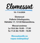 Olemme jälleen mukana Hämeenlinnan ELOMESSUILLA tulevana viikonloppuna, lauantaina klo 10–17 ja sunnuntaina klo 10–16. TERVETULOA tutustumaan osastoomme, joka on tällä kertaa sisätiloissa SÄÄSTÖPANKKI-AREENALLA, osasto nro 12. Ohessa kuva vuoden 2023 Elomesujen osastostamme ulkosalla.