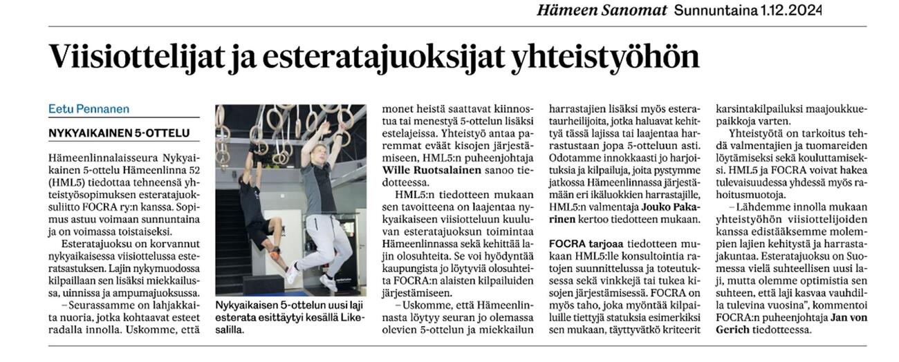 Suomen johtava viisiotteluseura, HML5 (Nykyaikainen 5-ottelu Hämeenlinna 52) ja Suomen esteratajuoksun liitto FOCRA ry (Finnish Obstacle Course Racing Association) ovat tehneet keskinäisestä yhteistyöstä sopimuksen, jonka on tarkoitus edistää ja laajentaa molempien urheilumuotojen toimintaa. Sopimus tulee voimaan 1.12.2024 ja on voimassa toistaiseksi. HML5:n tavoitteena on laajentaa nykyaikaiseen viisiotteluun kuuluvan esteratajuoksun toimintaa Hämeenlinnassa erilaisin harjoituksin ja kilpailuin sekä kehittää esteratajuoksun olosuhteita. HML5 voi hyödyntää Hämeenlinnassa jo olemassa olevia esteratoja FOCRA:n alaisten virallisten kilpailujen järjestämiseen. FOCRA puolestaan voi myöntää kilpailuille tietyn statuksen sen mukaan, täyttävätkö kilpailut FOCRA:n kriteerit esimerkiksi karsintakilpailuiksi maajoukkuepaikkoja varten. FOCRA tarjoaa HML5:lle konsultointia ratojen suunnittelussa ja toteutuksessa sekä mahdollisuuksien mukaan vinkkejä tai muuta tukea kilpailuiden järjestämisessä. FOCRA ja HML5 tekevät yhteistyötä esteratajuoksu-urheilun valmentajien ja tuomareiden löytämisessä sekä koulutuksessa. HML5 ja FOCRA hakevat tarvittaessa yhdessä erikseen sovittavia rahoitusmuotoja. "Lähdemme innolla mukaan yhteistyöhön viisiottelijoiden kanssa edistääksemme molempien lajien kehitystä ja harrastajakuntaa. Esteratajuoksu on Suomessa vielä suhteellisen uusi laji, mutta olemme optimistia sen suhteen, että laji kasvaa vauhdilla tulevina vuosina”, kommentoi FOCRA:n puheenjohtaja Jan von Gerich. Myös HML5:n puheenjohtaja Wille Ruotsalainen näkee yhteistyössä monia kehitysmahdollisuuksia. “Seurassamme on lahjakkaita nuoria, jotka kohtaavat esteet radalla innolla. Uskomme, että monet heistä saattavat kiinnostua tai menestyä 5-ottelun lisäksi estelajeissa. Yhteistyö antaa paremmat eväät kisojen järjestämiseen.” HML5:n valmentaja Jouko Pakarinen löytää yhteistyösopimukselle monia käytännön toteuttamistapoja. “Uskomme, että Hämeenlinnasta löytyy seuran jo olemassa olevien 5-ottelun ja miekkailun harrastajien lisäksi myös esterataurheilijoita, jotka haluavat kehittyä tässä lajissa tai laajentaa harrastustaan jopa 5-otteluun asti. Odotamme innokkaasti jo harjoituksia ja kilpailuja, joita pystymme jatkossa Hämeenlinnassa järjestämään eri ikäluokkien harrastajille.”
