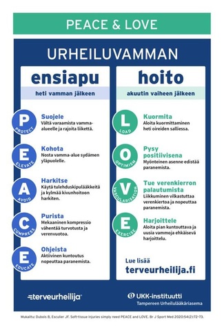 Urheiluvammojen ensiapu- ja hoito-ohje on päivitetty. Uusi ohje mukailee British Journal of Sports Medicine -lehdessä julkaistua kansainvälistä pehmytkudosvammojen PEACE and LOVE -suositusta. (1)