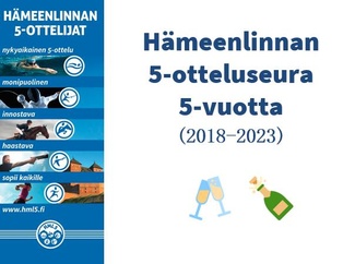 Suuret kiitokset osallistujille upeasta viisivuotisjuhlasta. Olipa upeat järjestelyt ja mukavasti kaiken ikäisiä otteluihmisiä paikalla. Juhlallisuudet aloitettiin kaikille sopivalla aloituskuohumaljalla (0.0 %) ja puheenjohtajan tervehdyssanoilla. Tämän jälkeen kuunneltiin Annelin soittamana Lasse Pihlajanmaan Mustalaisinspiraatio ja myöhemmin kuultiin vielä J.S.Bach Preludi & Fuga, B-duuri BWV 560. Tilaisuudessa kuultiin pari valmisteltua esitystä. Ensin seuran 5 v historiasta (Antti). Esityksen sanoman voisi kiteyttää seuraavasti ” Tällaista piristysruisketta ei nykyaikaisen 5-ottelun tiimoilta olla Suomessa nähty vuosikymmeniin”. Heti perään Sulevin esitys ”Suomi ja nykyaikainen viisiottelu 1912‒2023” -historiikin valmistelun esilletuomia löytöjä. Teoksen on tarkoitus valmistua painettuna 2024. Lisäksi kuultiin Emmyn ja Merjan terveiset. Tilaisuudessa jaettiin viime kesän 5-ottelun SM-kisojen ylimääräiset U15 ja nuorempien mitalit sekä kauden Laser Run Cup -kokonaiskilpailujen sarja voittajille liiton toimittamat pokaalit. Lopuksi vielä Willen järjestämä kaikille avoin pentathlon-kahoot-kisa, jonka voiton vei Katja. Ruokailu- ja kahvituspuoli hoidettiin mainiosti talkoomeiningillä, siitä isot kiitokset kaikille toimijoilla. Erityiskiitokset vielä Willelle mainiosta juhlapaikasta sekä erinomaisista järjestelyistä.
